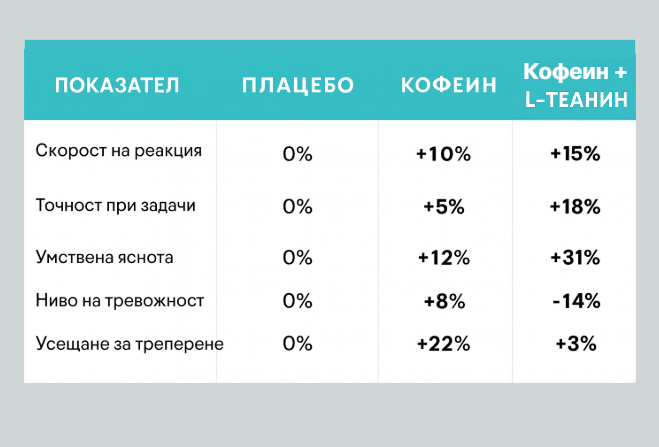 Комбинацията от кофеин и L-теанин намалява тревожността и премахва треперенето, докато УВЕЛИЧАВА фокуса и скоростта.