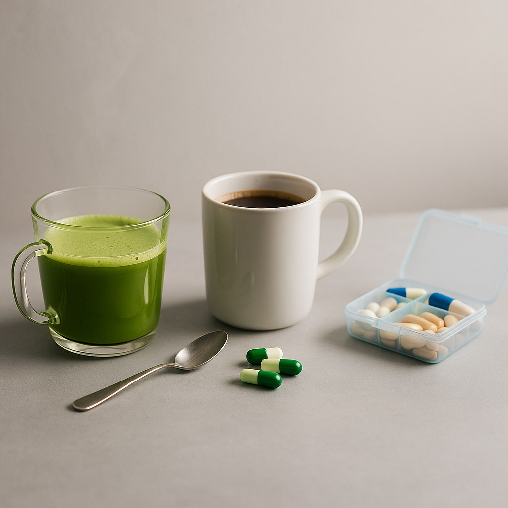 Опция 2: Вземаш L-теанин капсули + пиеш кафе (неудобно, не можеш да ги комбинираш правилно, не работи добре)
