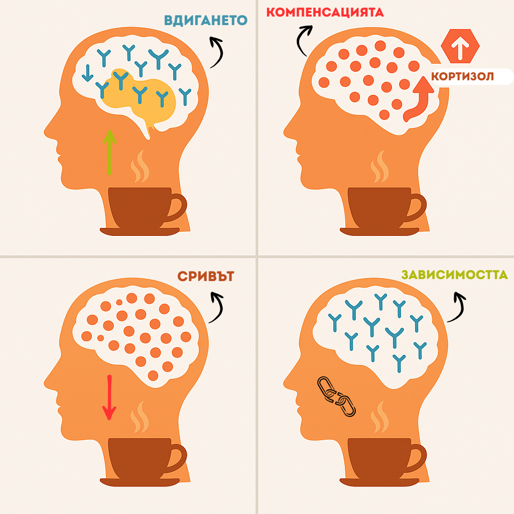Кофеинът блокира аденозиновите рецептори – молекулите, които казват на мозъка "уморен си, почини си". Резултат? Изкуствен прилив на енергия.
